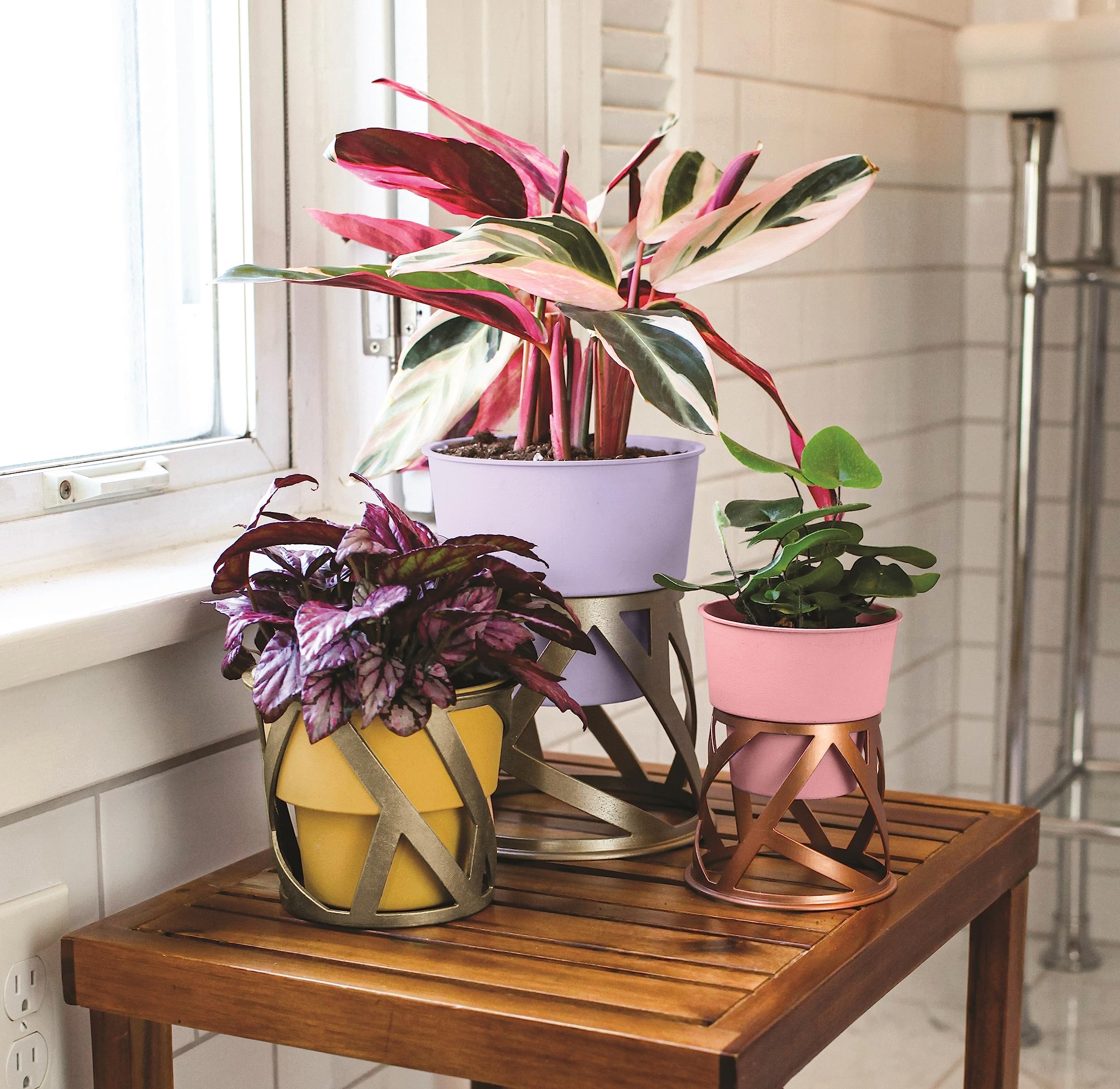The HC Companies 4 inch Indoor Plant Pot with Stand – Small Curio Blush Planter with a Geometric Stand in a Copper Finish